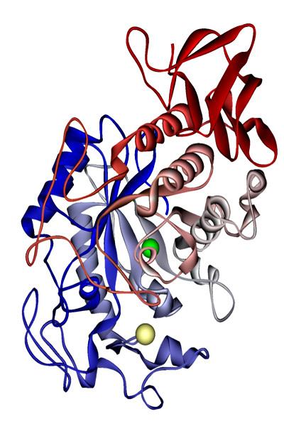 Diagrama en cinta de la enzima hidrolítica alfa-amilasa pancreática humana. Fuente: Wikimedia Commons