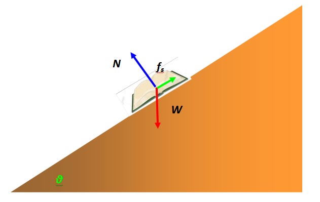 El libro de la imagen está en reposo y tiene una masa de 1.30 kg. El plano tiene un ángulo de inclinación de 30º. Encuentre el coeficiente de roce estático entre el libro y la superficie del plano.