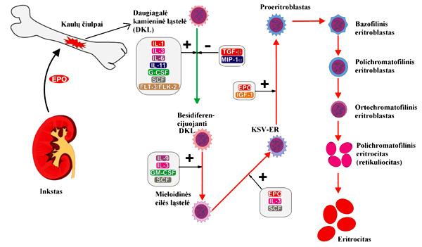 El eritrocito empieza a dispersar receptores para la eritropoyetina en la superficie de membrana. La eritropoyetina activa una serie de cascadas de transducción de señales intercelulares que inicialmente producen la síntesis de hemoglobina y hace que los reticulocitos actúen de manera más rápida y sean liberados a la circulación.