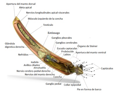 - Anatomía interna. Los escafópodos presentan sistemas digestivo, excretor, nervioso, circulatorio y reproductor. No tienen sistema respiratorio como tal, pues no presenta estructuras especializadas en esta función, por lo que el intercambio gaseoso ocurre a través del manto.