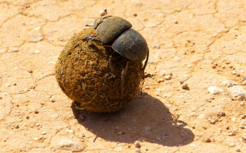El escarabajo pelotero es un coleóptero que se alimenta principalmente de heces de múltiples especies de mamíferos. Algunas especies moldean las heces con sus patas, hasta que adquiere la forma de una pelota homogénea, que transportarán hasta el sitio deseado. Estas heces superan en varios órdenes de magnitud su propio peso. Otras son capaces de construir túneles bajo la tierra.