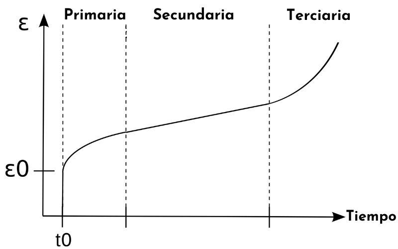3 etapas del comportamiento de cedencia de un material, primaria, secundaria y terciaria. Fuente: Strafpeloton2, Wikimedia Commons