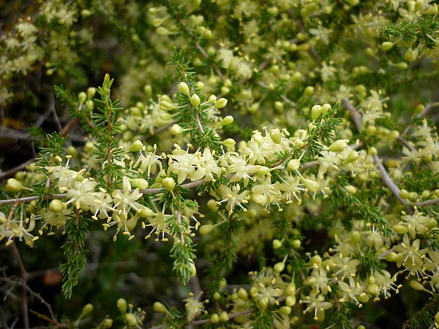 – Hojas. De forma escamosa y triangular, presentan una banda parduzca y los márgenes hialinos. Por lo regular, se agrupan en la base de un espolón rígido de 3-5 mm a lo largo de las ramas principales.