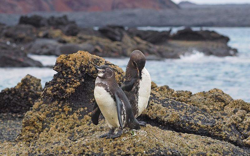 - Pingüino de Galápagos. Spheniscus mendiculus. El pingüino de Galápagos está siendo seriamente amenazado por los perros de las islas y la falta de comida.