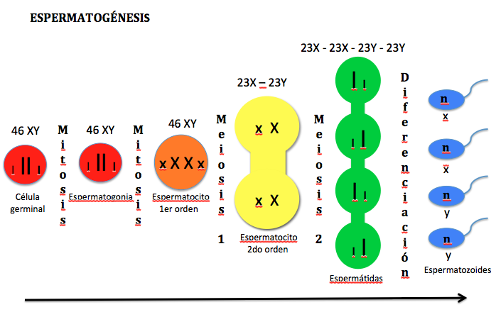 Los testículos representan la única clase de tejido donde ocurre meiosis (así como los ovarios lo son para las hembras). En ellos las espermatogonias son las células progenitoras de los espermatozoides, que son las células sexuales diferenciadas, producidas por meiosis y capaces de fecundar un óvulo.