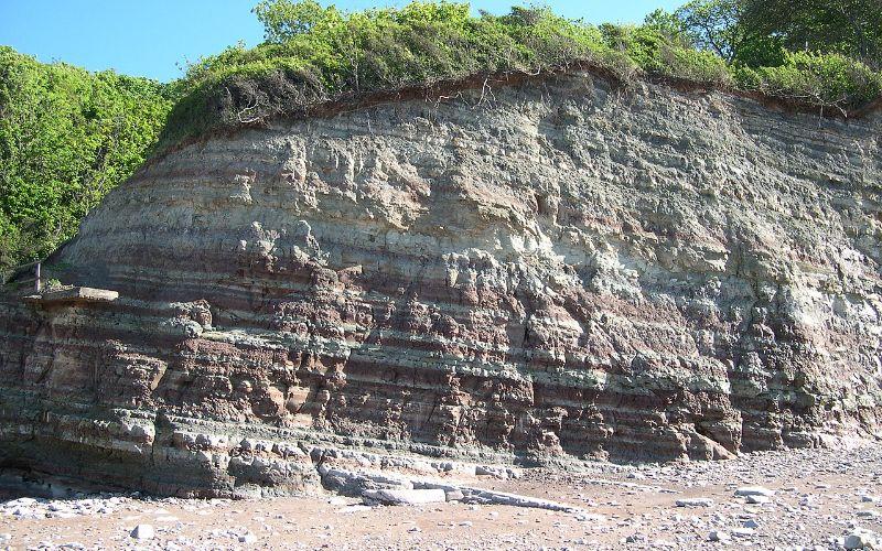 Capas de roca sedimentaria del Triásico en St. Audrie’s Bay, cerca de West Quantoxhead, en Somerset, Inglaterra. Fuente: Margaret W. Carruthers (mwcarruthers) https://www.flickr.com/people/64167416@N03/, CC BY 2.0, Wikimedia Commons