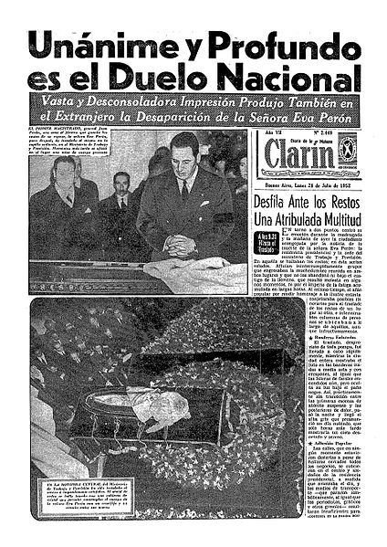 Portada del periódico Clarín por la muerte de Eva Perón. Fuente: Clarín / Public domain