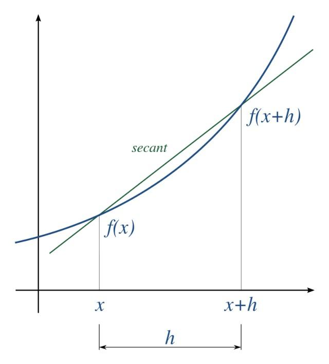 Este cociente se interpreta geométricamente como la pendiente de una recta secante a la curva, es decir, una recta que pasa por dos puntos de ella. Las coordenadas de dichos puntos son: [x, f(x)] y [x+h; f(x+h)], como se ve en la siguiente figura:
