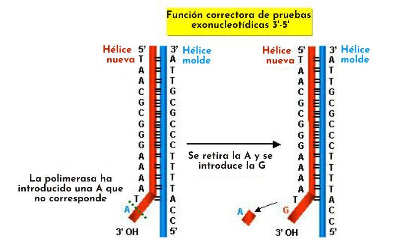 - Actividad exonucleasa en bacterias. En las bacterias, las tres polimerasas presentan actividad exonucleasa. La polimerasa I tiene actividad en dos direcciones: 5’-3’ y 3’-5’, mientras que la II y la III solamente presenten actividad en sentido 3’-5’. La actividad 5’-3’ permite que la enzima retire el primer del ARN, añadido por una enzima denominada primasa. Posteriormente, la brecha creada será rellenada con nucleótidos recién sintetizados. El primer es una molécula formada por unos pocos nucleótidos que permite dar inicio a la actividad de la ADN polimerasa. Por lo que siempre estará presente en el evento de replicación. En caso de que la ADN polimerasa añada un nucleótido que no corresponde, puede corregirlo gracias a la actividad de la exonucleasa.