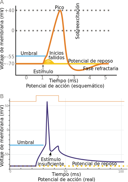 - Nivel umbral para el disparo del potencial de acción: entre -75 y -65 mV.