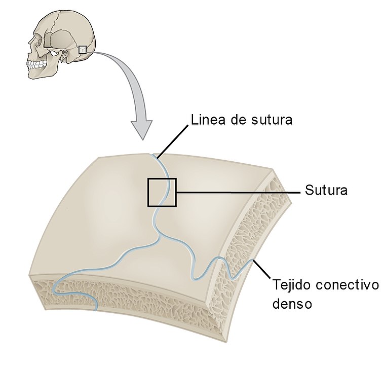 Fibras de Sharpey en el cráneo. Fuente: OpenStax College (modificado) – Wikimedia commonsModificado de File:904 Fibrous Joints.jpg, CC BY-SA 3.0, Wikimedia Commons