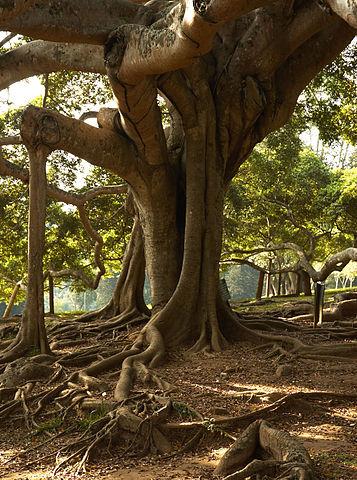 El ficus es una planta del tipo estrangulador, en su etapa juvenil crece sobre otra planta como trepadora emitiendo raíces aéreas. A partir de estas raíces, la planta se sujeta al suelo, se fortifica, ahoga la planta trepada y se mantiene erguida.