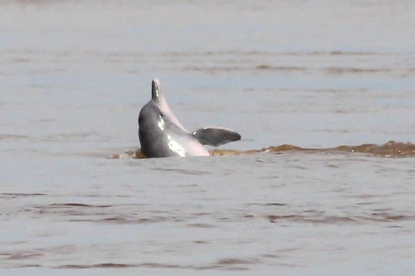 Su coloración va de gris oscuro cuando jóvenes hasta rosado en los adultos, y su hocico es largo y estrecho. Además del sistema de biosonar (localización por rebote del sonido) característico de los delfines, también posee buena vista.