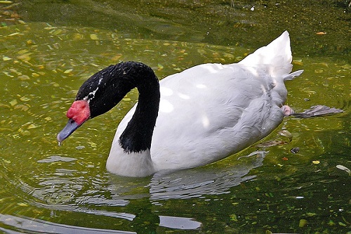 Posee una cabeza y cuello negros con cuerpo blanco y una carúncula o excrecencia roja en la base superior del pico.