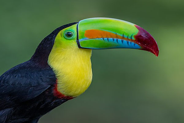 El tucán del Chocó es más pequeño que el anterior, con cuerpo de coloración similar, pero el pico es distinto, con la mitad superior de color amarillo intenso y la inferior negra.