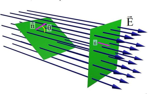 En la figura de arriba se muestra una superficie plana atravesada por un campo eléctrico E. Cuando el vector unitario normal a la superficie n y el campo E son paralelos, la cantidad de líneas de campo que atraviesa la superficie es máxima. Pero a medida que aumenta el ángulo θ entre n y E, el número de líneas que pasa por la superficie verde es menor.