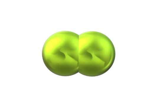 - Molécula diatómica. El átomo de flúor en su estado basal tiene siete electrones de valencia, que están en los orbitales 2s y 2p, de acuerdo a la configuración electrónica: [He] 2s2 2p5. La teoría del enlace de valencia (TEV) establece que dos átomos de flúor, F, se enlazan covalentemente para poder completar cada uno su octeto de valencia. Esto ocurre rápidamente porque apenas le falta un electrón para volverse isoelectrónico al gas noble neón, y sus átomos son muy pequeños, con una carga nuclear efectiva muy fuerte que demanda fácilmente electrones del entorno. La molécula F2 (imagen inferior), tiene un enlace covalente simple, F-F. A pesar de su estabilidad en comparación a los átomos F libres, es una molécula sumamente reactiva: homonuclear, apolar, y ávida por electrones. Por eso, el flúor, como F2, es una especie muy tóxica y peligrosa. Debido a que el F2 es apolar, sus interacciones dependen de su masa molecular y las fuerzas de dispersión de London. En algún momento, la nube electrónica en torno a ambos átomos F debe deformarse y originar un dipolo instantáneo que induzca otro en una molécula vecina, para que se atraigan lenta y débilmente.