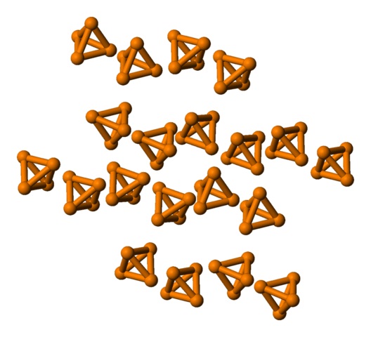 En su lugar, a temperatura ambiente los átomos P prefieren organizarse covalentemente de otra manera: en una molécula tetraédrica P4: