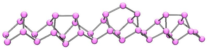 - Fósforo violeta o de Hittorf. El fósforo violeta es la evolución final del fósforo rojo. Como se aprecia en la imagen inferior, sigue consistiendo en una cadena polimérica, pero ahora las estructuras son más intrincadas. Pareciera que la unidad estructural ya no es el P4 sino el P2, dispuesto de tal modo que forman anillos pentagonales irregulares. A pesar de lo asimétrica que luce la estructura, estas cadenas poliméricas logran ordenarse lo suficientemente bien y con periodicidad para que el fósforo violeta establezca cristales monoclínicos.