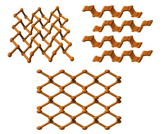 - Fósforo negro. Y finalmente tenemos el alótropo de fósforo más estable: el de color negro. Se prepara calentando el fósforo blanco bajo una presión de 12.000 atm. En la imagen inferior (rejilla de abajo), puede verse que su estructura, desde un plano superior, tiene cierto parecido con la del grafito: es una red escarpada de anillos hexagonales (aunque parezcan cuadrados). En la esquina superior izquierda de la imagen, puede apreciarse mejor lo comentado. Los entornos moleculares de los átomos P son pirámides trigonales. Nótese que la estructura vista lateralmente (esquina superior derecha), se dispone en capas que calzan unas sobre las otras. La estructura del fósforo negro es bastante simétrica y ordenada, lo cual concuerda con su capacidad de establecerse como cristales ortorrómbicos. El apilamiento de sus capas poliméricas hace que los átomos P no estén disponibles para muchas reacciones químicas, y por eso es considerablemente estable y poco reactivo. Aunque no esté de más mencionarlo, las fuerzas de dispersión de London y las masas molares de estos sólidos fosfóricos son las que rigen algunas de sus propiedades físicas, mientras que sus estructuras y enlaces P-P, definen las propiedades químicas y otras.