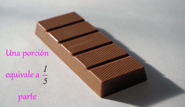 Supongamos que nos comemos 3 pedazos de chocolate. Diríamos que nos hemos comido 3/5 partes de la barra y quedan 2/5 partes para compartir con un amigo. También podemos decir que nos comimos “tres quintos del chocolate” y obsequiamos “dos quintos” al amigo.