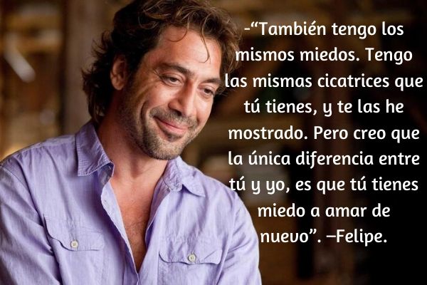 -“También tengo los mismos miedos. Tengo las mismas cicatrices que tú tienes, y te las he mostrado. Pero creo que la única diferencia entre tú y yo, es que tú tienes miedo a amar de nuevo”. –Felipe.