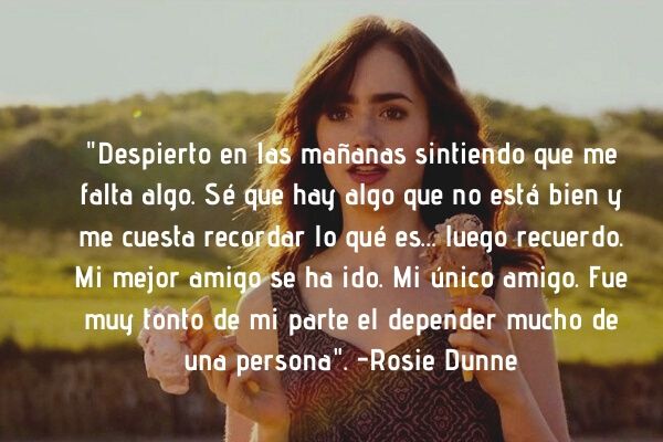 -“Despierto en laS mañanas sintiendo que me falta algo. Sé que hay algo que no está bien y me cuesta recordar lo qué es… luego recuerdo. Mi mejor amigo se ha ido. Mi único amigo. Fue muy tonto de mi parte el depender mucho de una persona”. –Rosie Dunn.