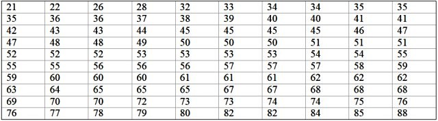 0; 12; 20; 35; 35; 38; 40; 45; 45, 45; 59; 55; 58; 65; 65; 70; 72; 90; 95; 100; 100; 110; 110; 110; 120; 125; 125; 130; 130; 130; 150; 160; 170; 175; 180; 185; 190; 195; 200; 220.