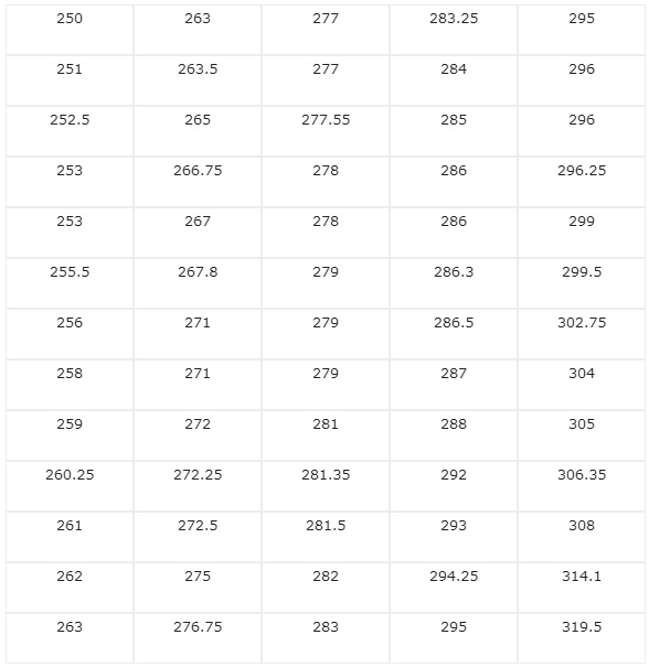 Se obtienen los siguientes resultados: 251 252,5 314,1 263 305 319,5 265 267,8 304 306,35 262 250 308 302,75 256 258 267 277,55 281,35 255,5 253 259 263 266,75 278 295 296 299,5 263,5 261 260,25 277 272,5 271 286 295 278 279 272,25 286,3 279 296,25 271 272 279 275 277 279 276,75 281 287 286,5 294,25 285 288 296 283,25 281,5 293 284 282 292 299 286 283