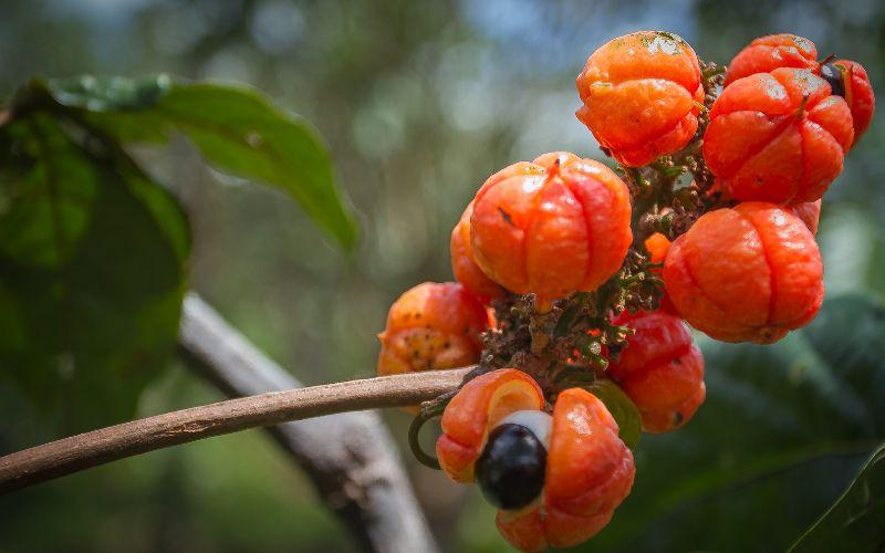 Así como la gulupa, el guaraná es nativo de la región amazónica, siendo bastante popular y consumido en el territorio brasileño. Sus semillas se secan al sol y se muelen, y se emplean en la elaboración de bebidas energéticas gracias a una sustancia estimulante, parecida a la cafeína, denominada guaranina.