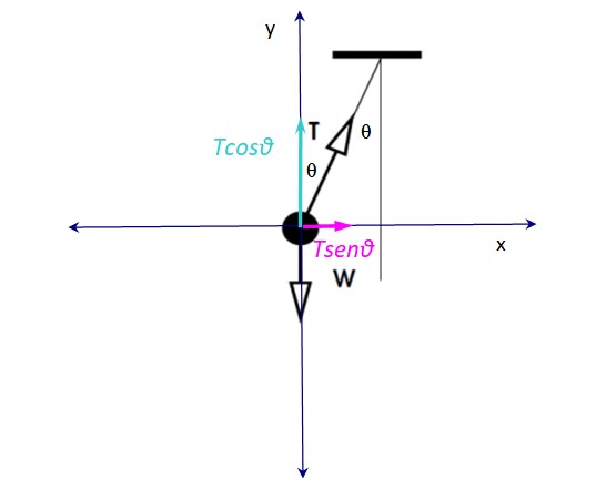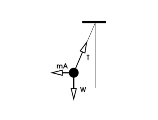 Como en el caso anterior, el peso y la componente vertical de la tensión se compensan. Pero la componente horizontal se equilibra con la fuerza ficticia Fg = mA, de tal forma que: