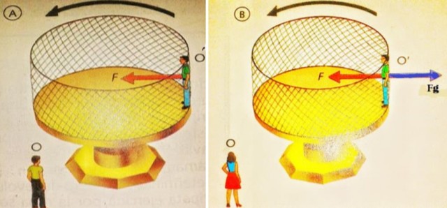 En la siguiente imagen, a la izquierda, un observador O se encuentra de pie y mira a O’, quien se encuentra sobre la plataforma que gira en el sentido indicado. Para O, que es un marco inercial, ciertamente O’ se mantiene girando debido a la fuerza centrípeta Fc producida por la pared de la rejilla sobre la espalda del O’.
