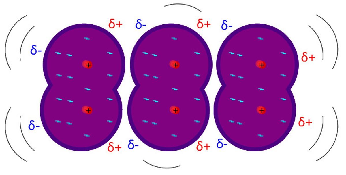 Esto se debe a que la región δ- perturba la nube vecina, sus electrones sienten la repulsión electrostática y se orientan en el polo opuesto, apareciendo δ+.
