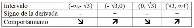 Se concluye que la función decrece en los intervalos (-∞,- √3) y (0, √3) y crece en los restantes intervalos. Se comprueba fácilmente graficando la función original en Geogebra.