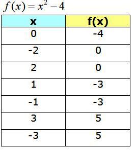 La gráfica de esta función es una parábola, que abre hacia arriba y tiene en A un punto mínimo, llamado vértice, de coordenadas (0,−4). Es interesante destacar que los valores de f(x) comienzan en y = -4 hasta ∞. Este es el rango de la función.