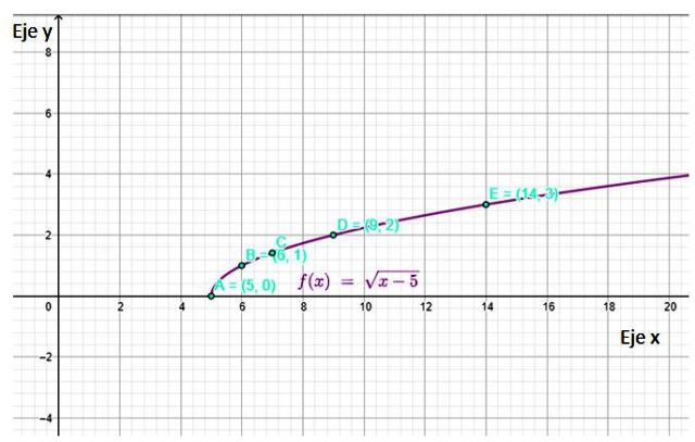 Por lo tanto, para la tabla solamente se pueden escoger valores mayores o iguales a 5. En cuanto a las intersecciones con los ejes coordenados, la única posibilidad es hacer y = 0, y entonces x = 5.