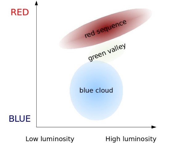Finalmente, el valle verde es una región de transición donde se encuentran galaxias que tienen población estelar joven y antigua. La Vía Láctea y Andrómeda son ejemplos de este tipo de galaxias.