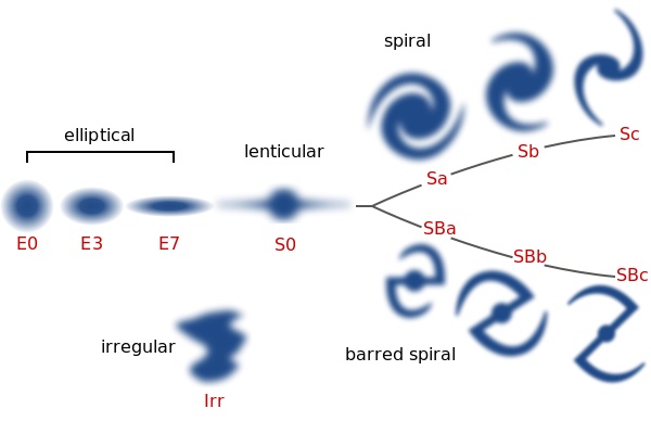 Hubble diseñó el esquema en la creencia de que representaba una suerte de evolución de las galaxias, pero hoy en día se sabe que no es así. En la secuencia se utilizan letras para designar las galaxias: E para las galaxias elípticas, S para las galaxias en espiral e Irr para las de forma irregular.