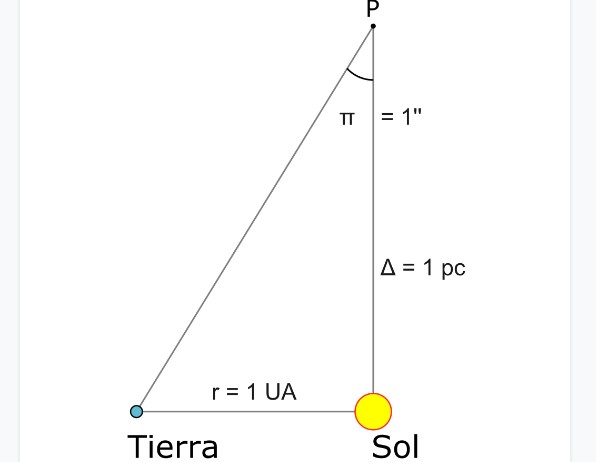 – Unidades de medida. Existen galaxias gigantes y muy brillantes, como la Vía Láctea y Andrómeda, y también galaxias llamadas “enanas”, hasta 1.000 veces menos brillantes. Para familiarizarse con los tamaños conviene conocer algunas unidades de medida usadas en astronomía. En primer lugar, tenemos el año-luz. El año-luz es una unidad de distancia que equivale a la distancia que recorre la luz en un año. Siendo que la velocidad de la luz es de 300.000 km/s, multiplicando por la cantidad de segundos que hay en 365 días, el resultado es de aproximadamente 9 billones y medio de kilómetros. A efectos comparativos, la distancia del Sol a la Tierra es de 8.5 minutos-luz, unos 150 millones de kilómetros, que equivale aproximadamente a una UA, o unidad astronómica, útil en mediciones dentro del Sistema Solar. La estrella que le sigue en cercanía al Sol es Próxima Centauri, a 4.2 años-luz. La UA da lugar a otra unidad muy utilizada: el parsec o paralaje de un segundo de arco. Que un punto esté a la distancia de un parsec, significa que su paralaje es igual a 1 segundo de arco entre la Tierra y el Sol. La siguiente figura lo aclara: