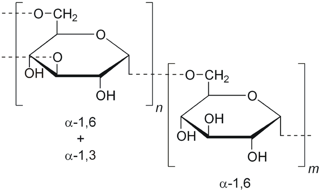 La mayoría de los glucanos consisten en cadenas lineales, pero aquellos que presentan ramificaciones se unen a estas a través de enlaces glucosídicos de tipo α (1-4) o α (1-4) en combinación con enlaces α (1-6).