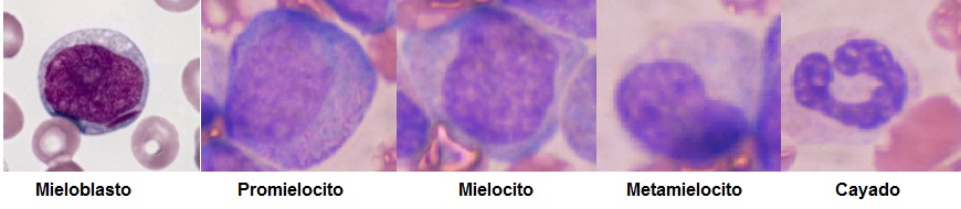 - Granulocito maduro. Estas comprenden los 3 tipos de granulocitos que se encuentran en la sangre periférica: segmentados neutrófilos, segmentados eosinófilos y segmentados basófilos.