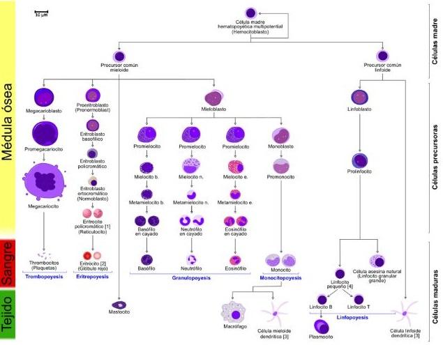 Las células de la sangre surgen de una célula madre pluripotencial que se va diferenciando en diversos linajes celulares, y estas a su vez se diferencian en líneas celulares un poco más diferenciadas, hasta llegar a las células maduras circulantes.