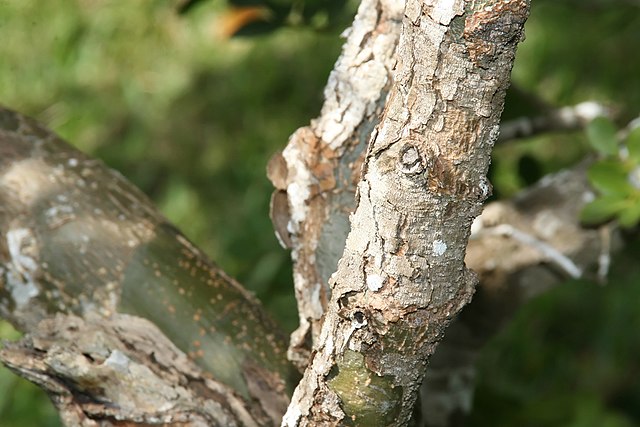 – Apariencia. Especie arbustiva perenne de porte bajo a medio, de crecimiento lento, que alcanza los 8-15 m. El tallo generalmente sinuoso posee ramas nudosas con la corteza lisa y surcos poco profundos, su madera es extremadamente dura.