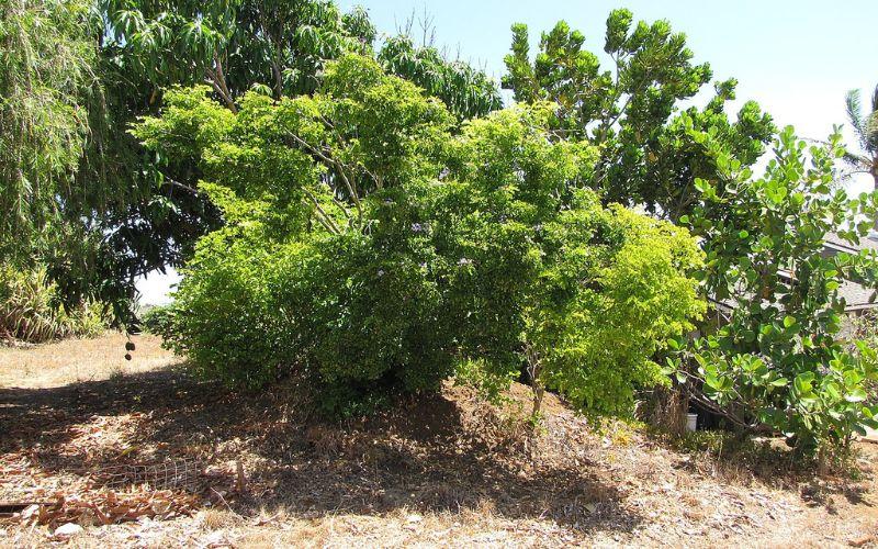 De crecimiento sinuoso, puede crecer hasta los 15 m. El tallo tiene la corteza lisa y variegada, coronado por una copa amplia y ovalada. Su follaje denso está constituido por hojas foliadas de color verde brillante y numerosas flores de color azul-violáceo con estambres amarillos.