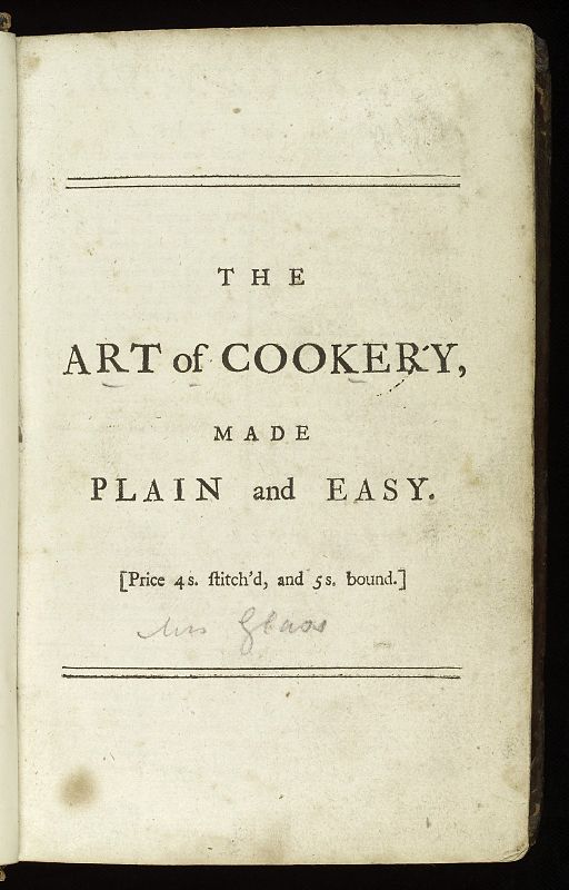 Pero en 1747, Hannah Glasse publicó anónimamente El arte de la cocina, simple y fácil: supera con creces cualquier cosa hasta ahora publicada. El libro contenía casi 1.000 recetas y estaba expresamente dirigido a las domésticas y amas de casa.
