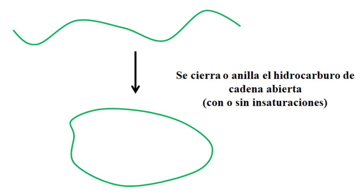 Supóngase que se tiene un hidrocarburo de cadena abierta (con o sin insaturaciones o ramificaciones). Si pudiéramos unir sus extremos, se crearía un anillo o ciclo (como en la imagen superior).