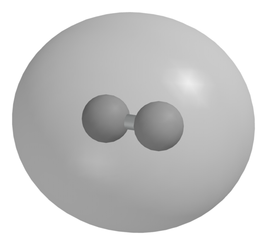 Los átomos de hidrógeno son muy pequeños y apenas tienen un electrón para formar enlaces covalentes. Cuando dos de estos átomos se unen, dan lugar a una molécula diatómica, H2, el hidrógeno molecular gaseoso (imagen superior). Cada esfera blanca corresponde a un átomo H individual, y la esfera global a los orbitales moleculares.