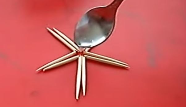 Se toman cinco palillos de madera y se parten a la mitad, pero sin que se separen completamente. Luego se disponen en un círculo como el que se muestra en la figura siguiente: