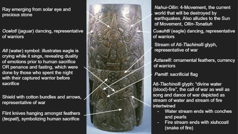 El guerrero águila lleva en sus manos representaciones de sacrificio y de guerra. De los guerreros jaguar se ven tres imágenes; una al lado de Nahui Ollin y otras dos en los soportes.