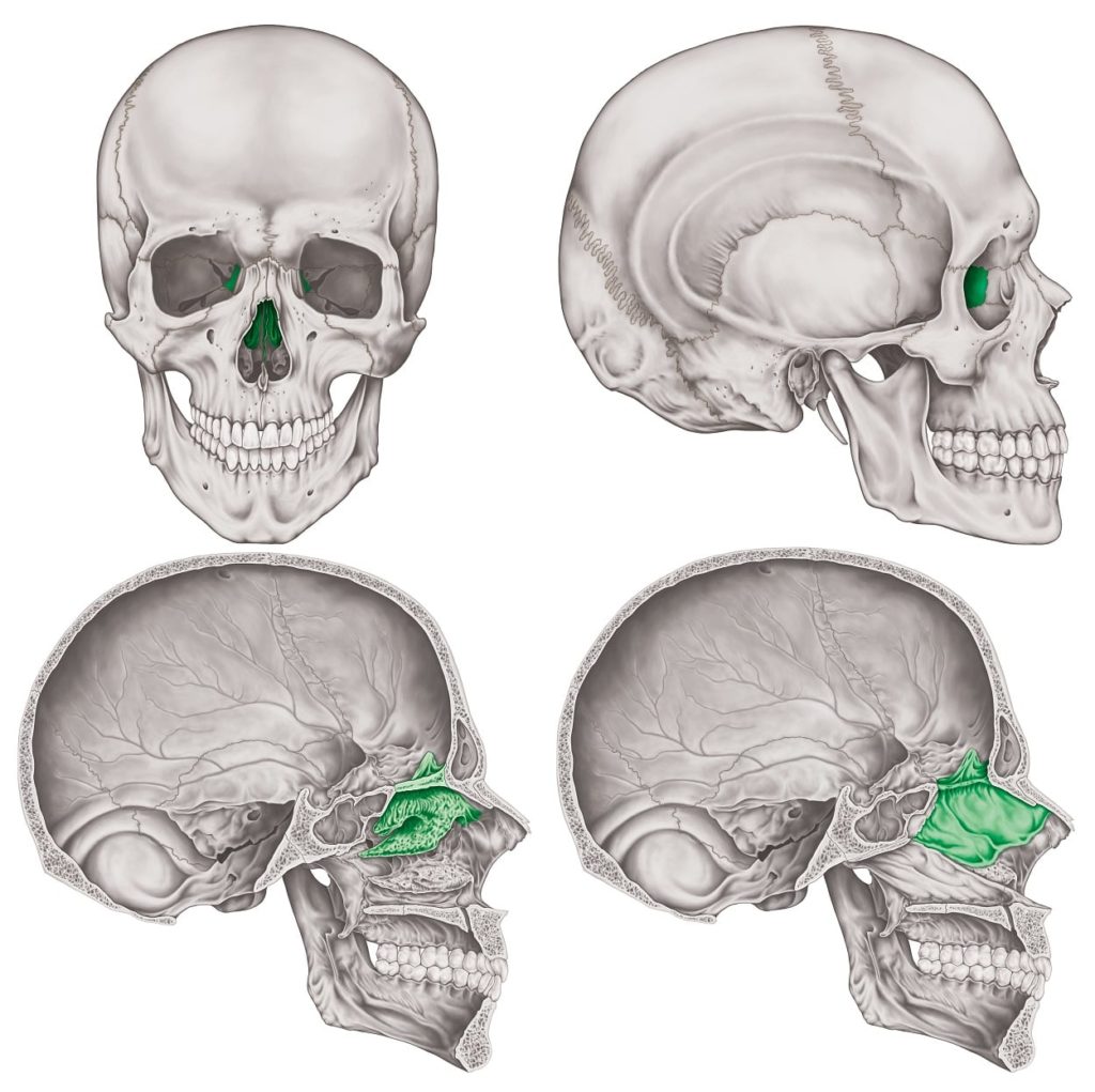 En este laberinto etmoidal se ubican los cornetes nasales medios y superior en la cara medial. El cornete nasal inferior se encuentra en el hueso palatino.